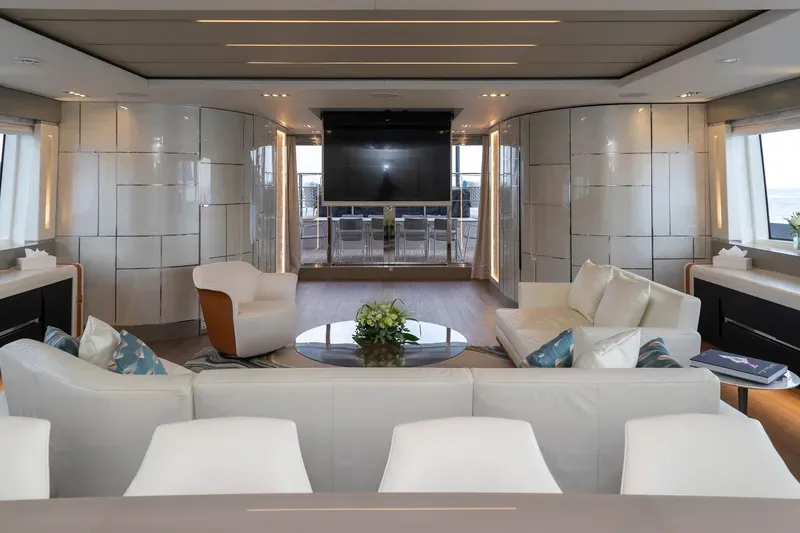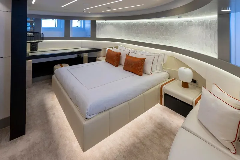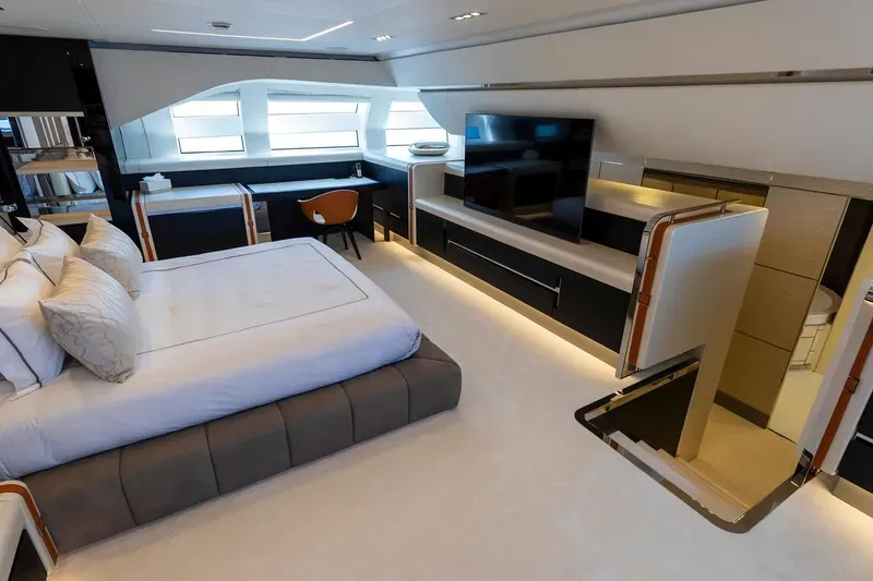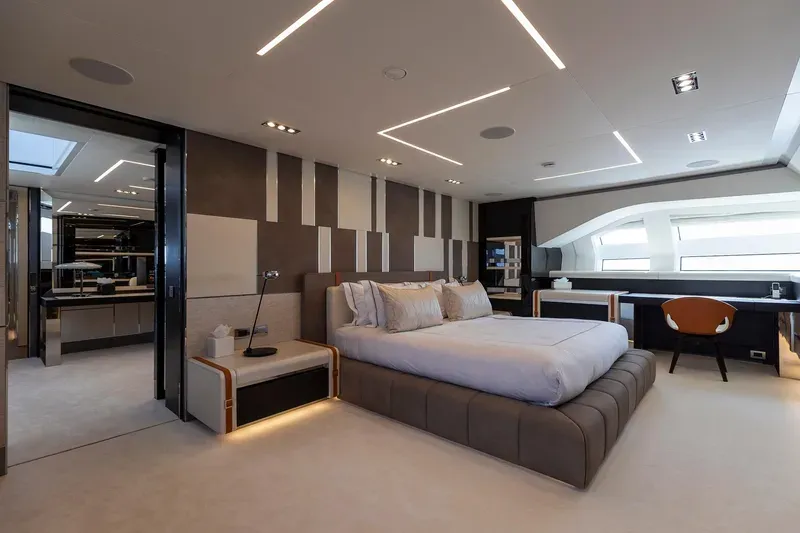 Ana güvertede yer alan geniş master suite, tam boy cam yüzeyler sayesinde kesintisiz deniz manzarası sunar.